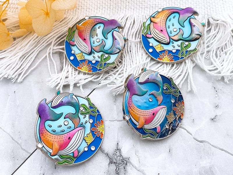 徽章常作為廣告活動品、活動周邊商品、文創設計等,是現今最常見的活動禮贈品之一。不想讓生動的徽章設計被傳統的鍍金、鍍鎳、鍍銅色侷限嗎? 仙氣十足的極光色胸章,可單獨使用極光色或搭配透明色、假琺瑯、烤漆入色,讓您的胸章更繽紛閃耀,比起一般漸層印刷色更有晶亮感。